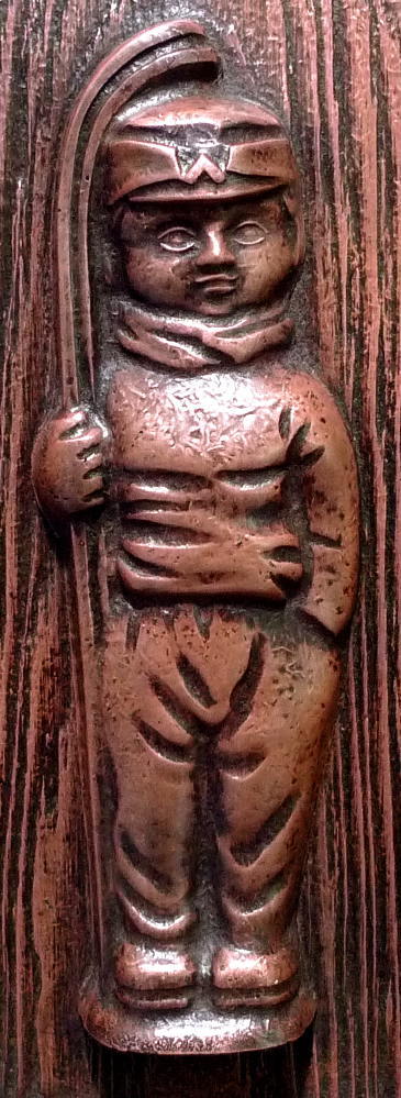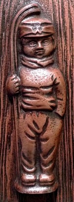 Cast from a 1940's chocolate mold. The background is sandblasted wood upon which the chocolate mold was fastened for the final casting.