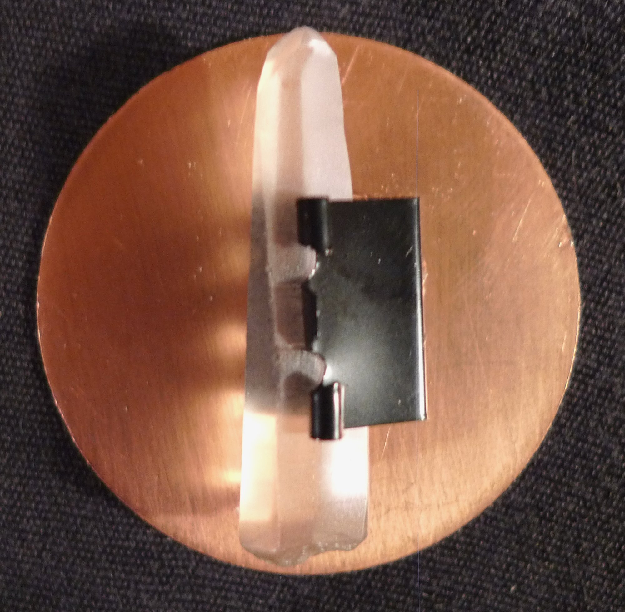 The copper disc does three things - it acts as a stage for more powder, it acts as a resonator so that external vibrations can more directly interact with the crystal and it acts as a sort of virtual or higher dimensional copper/aluminum "battery" with the quartz crystal residing at that interface.