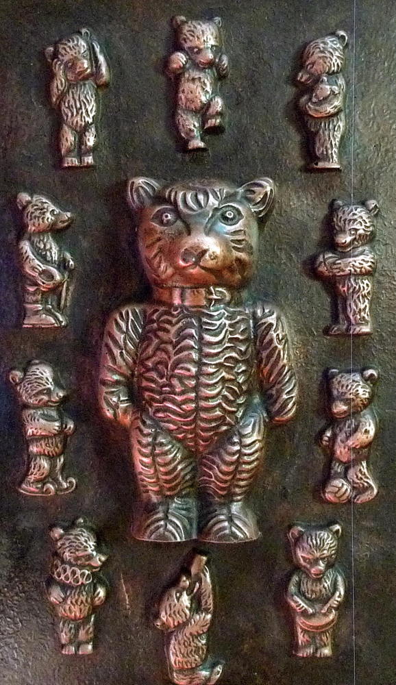 A collage of 1940's tinned chocolate molds from Germany. These often end up in the childrens' rooms where their whimsy is accompanied by protection from negative energies and spirits.